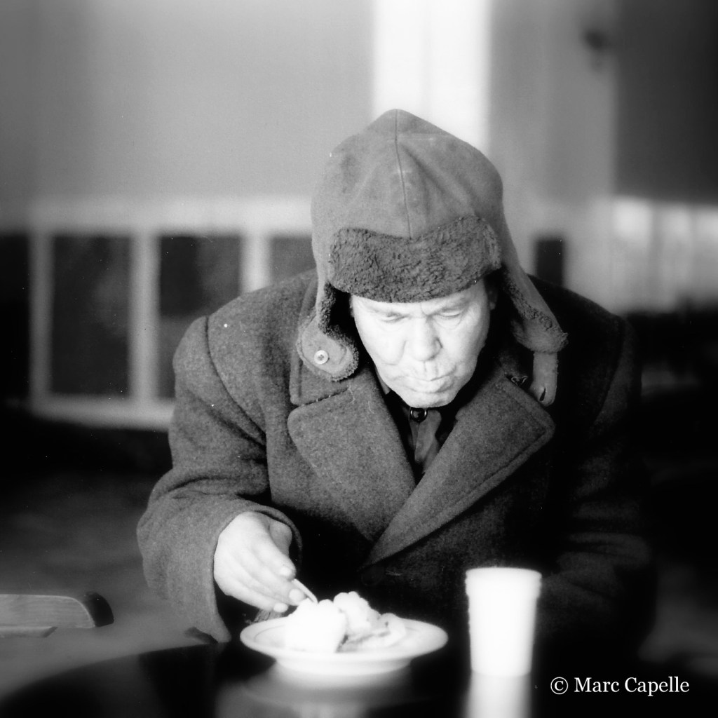 À la table d’une cafeteria presque vide, un vieil homme se réchauffe avec un peu de mamaliga (polenta) et un gobelet de thé ou de café . Moment de solitude.